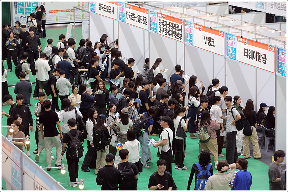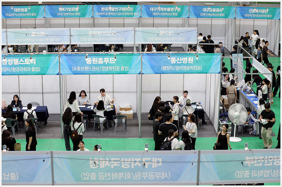 24일(수)에는 고용노동부 대학일자리플러스센터 사업을 수행하는 계명대학교, 계명문화대학교, 영남이공대학교, 영진전문대학교 등 4개 대학과 지역고용센터, 대구광역시원스톱일자리지원센터, 대구상공회의소가 공동 주관한 ‘2025 청년이음 일자리 박람회’가 열렸다. 신용보증기금, 한국도로공사, iM뱅크, 티웨이항공 등 30개 공공기관과 기업이 참여했으며, ▲채용 트렌드와 직무 정보를 소개하는 ‘일자리이음관’ ▲청년 일자리 정책을 안내하는 ‘정보이음관’ ▲캐리커처·캘리그래피·룰렛 이벤트를 진행한 ‘소통이음관’ 등이 운영돼 참가자들의 호응을 얻었다.