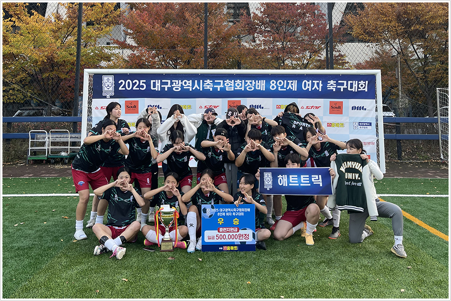 계명대학교 여자축구 동아리 ‘해트트릭’이 지난 9일(토) 대구FC 유소년 축구장에서 열린 ‘2025 대구광역시 축구협회장배 8인제 여자축구대회’에서 우승을 차지했다.