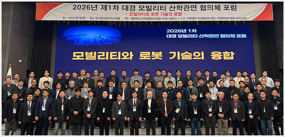 계명대학교 산학연협력단지사업단은 3월 19일(목) 오후 3시 대구 그랜드호텔에서 미래자동차 혁신융합대학사업단(COSS), 미래형모빌리티융합기술혁신센터(UIC), RISE 사업단과 공동으로 ‘대경 모빌리티 산학관연 협의체(이하 협의체)’ 포럼을 개최했다. 이번 포럼은 모빌리티와 로봇 기술이 융합된 ‘피지컬 AI(Physical AI) 플랫폼’ 중심의 산업 환경 변화와 지역 산업의 경쟁력 강화를 위한 협력 방안을 모색하기 위해 마련됐다.